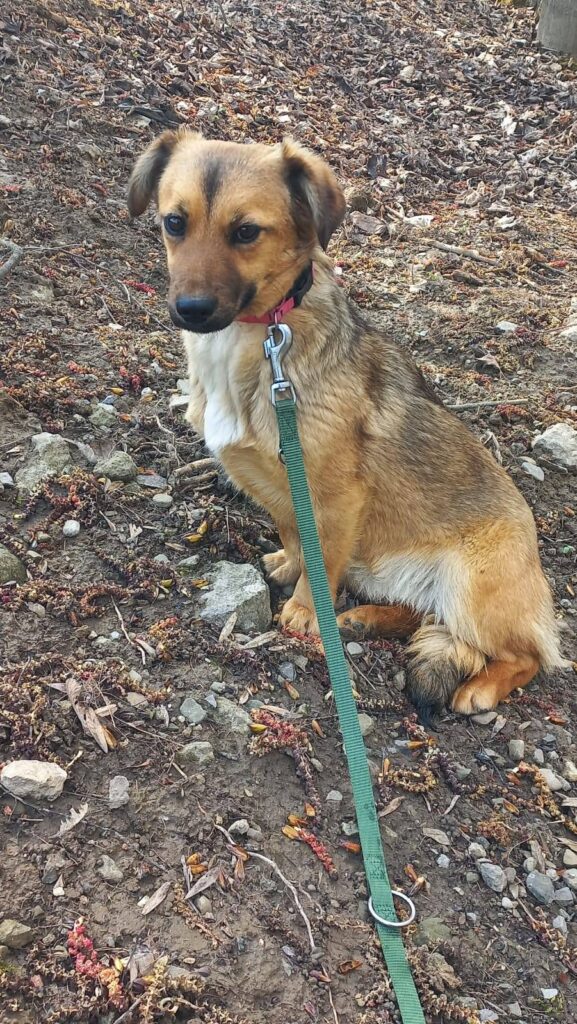Hefe – około 1 rok, 8 kg, 38 cm. Bojaźliwa suczka, która robi postępy i powoli się otwiera. Trafiła do nas z gminy Frysztak. Szukamy dla niej spokojnego, dobrego domu, który da jej czas i pokaże, że człowiek może być przyjacielem.
